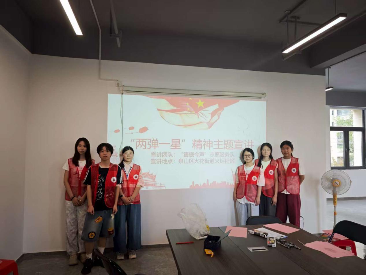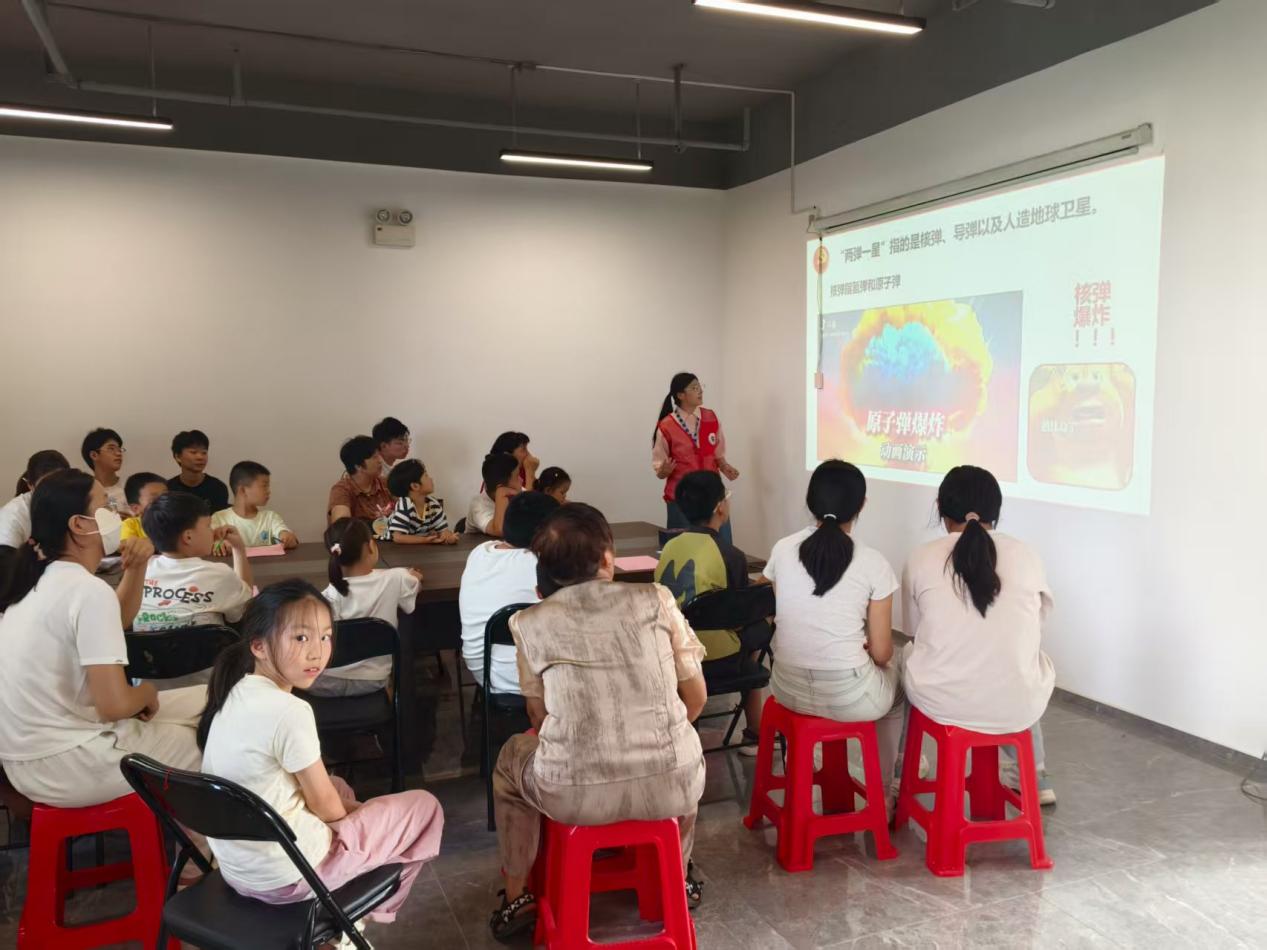 “星辰闪耀,薪火相传。”为深入弘扬“两弹一星”精神,推动谱写中国式现代化新篇章,江苏师范大学“语振今声”志愿服务队于8月下旬前往泉山区火花街道火炬社区展开“两弹一星”精神宣讲活动,带领社区孩子们用故事、绘画等形式感受“热爱祖国、无私奉献、自力更生、艰苦奋斗、大力协同、用于攀登”的“两弹一星”精神,通过创新性的教育形式将科技知识与爱国主义教育相结合。